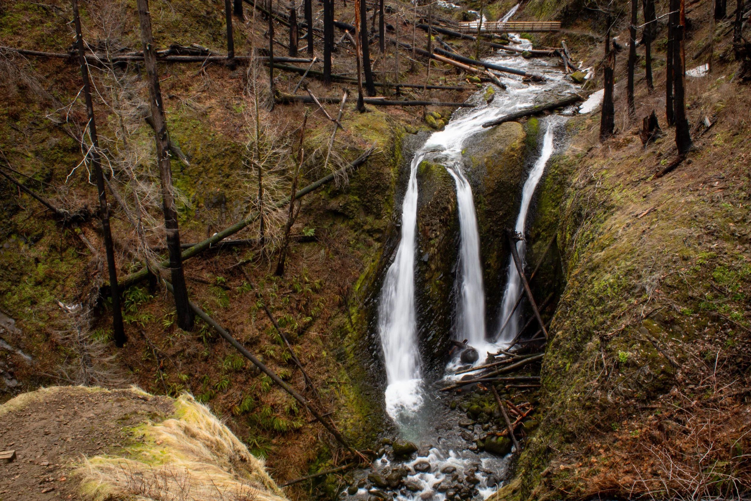 Continue on the steady uphill trail for another 0.8 miles through the burnt forest until you reach the viewpoint for 100-foot Triple Falls. Take care around the viewpoint. It slopes downward toward a drop-off. After walking past so many charred trees, it was reassuring to see Triple Falls looking just the same as it had before the Eagle Creek fire. While the forest around it is transformed, the three streams of the falls are still as beautiful and memorable as ever.